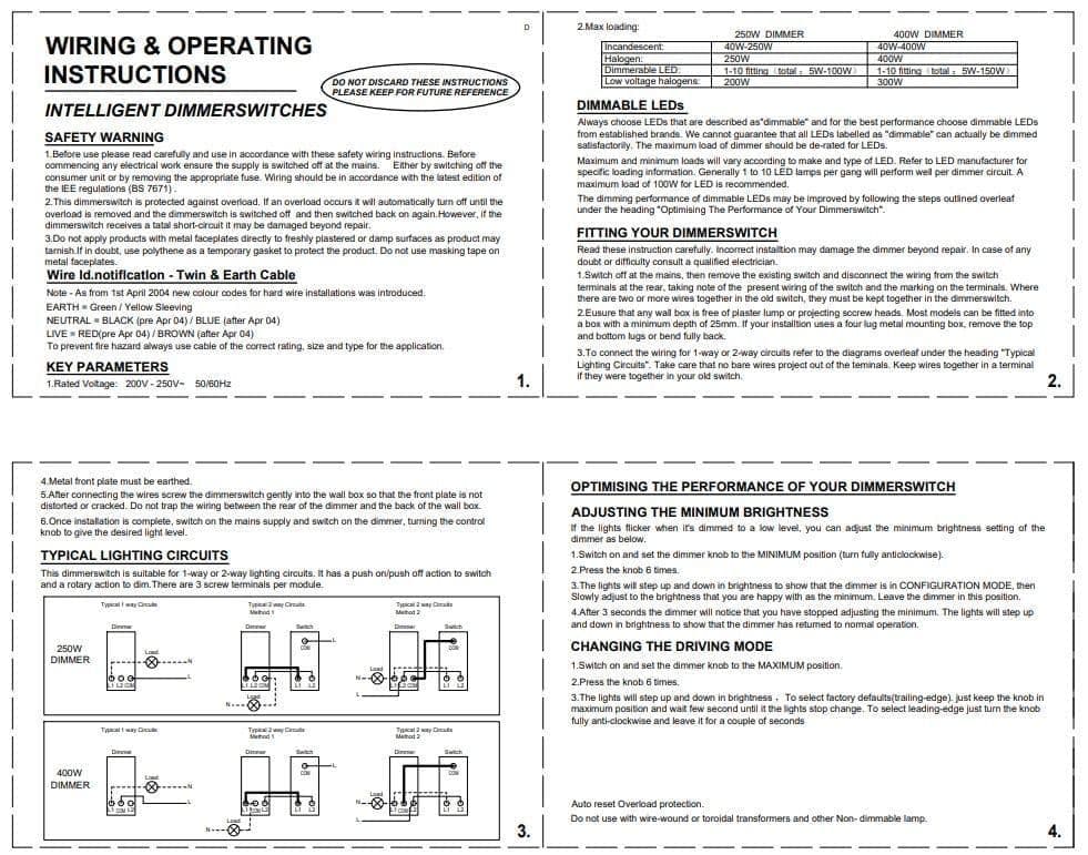 LED: 1 to 10 LED bulbs (5-150W). 300W max load if used with halogen bulbs.